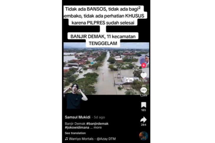 Sebuah unggahan video di TikTok menarasikan pemerintah tidak memberikan bantuan khusus kepada warga yang terdampak banjir Demak karena Pilpres telah usai. Berikut narasi dalam unggahan tersebut: