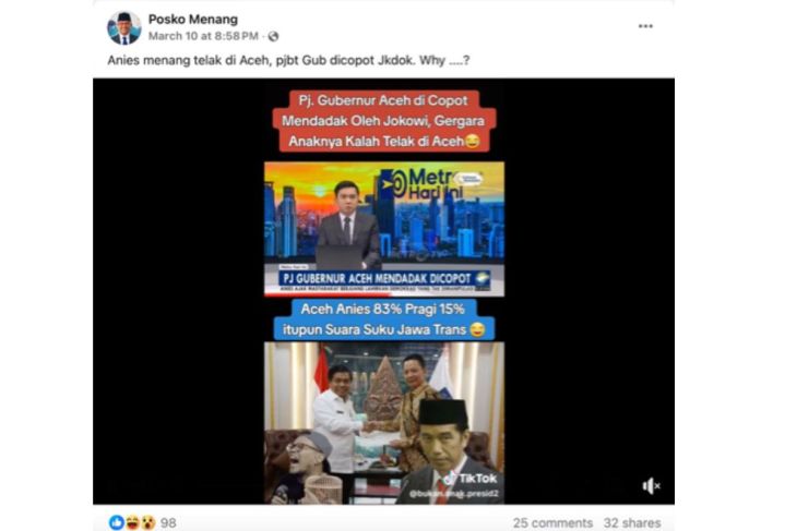 JAKARTA,suarabalikpapan.com– Sebuah unggahan video di Facebook menarasikan Pj Gubernur Aceh langsung dicopot oleh Presiden Jokowi setelah pasangan calon nomor urut satu Anies-Muhaimin menang telak di Aceh.