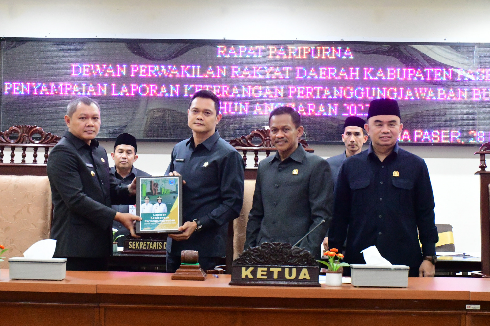 Ketua DPRD Hendra Wahyudi menerima draft LKPj Bupati dr Fahmi Fadli terhadap pelaksanaan APBD Kabupaten Paser Tahun Anggaran 2022 di Gedung Paripurna DPRD Paser, Selasa (28/3/2023).