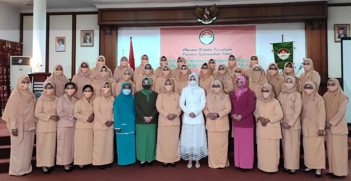 TANA PASER,suarabalikpapan.com- Dharma Wanita Persatuan Provinsi Kalimantan Timur menggelar agenda serah terima jabatan dan pengukuhan kepengurusan Dharma Wanita Kabupaten Paser periode 2019-2024, di Pendopo Kabupaten, Kamis (03/06/2021). Serah terima jabatan ditandai dengan pendatangan oleh Ketua Dharma Wanita Persatuan Provinsi Kalimantan Timur Liza Febriani Saba’ni.