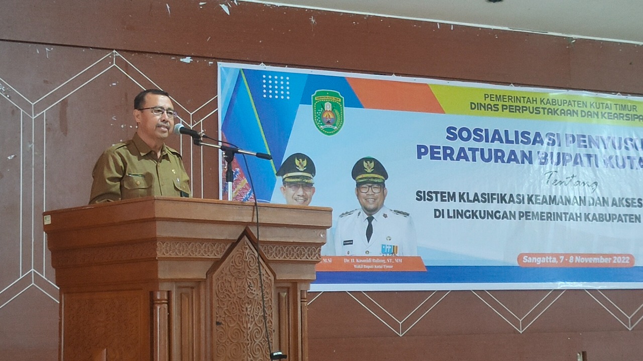 SANGATTA,suarabalikpapan.com–Dinas Perpustakaan dan Kearsipan (Dispursip) Kabupaten Kutai Timur menggelar Sosialisasi Penyusunan Peraturan Bupati Kutai Timur tentang sistem klasifikasi keamanan dan akses arsip dinamis, di Lingkungan Pemkab Kutai Timur, di Ruang Serba Guna (GSG) Perkantoran Bukit Pelangi Sangatta, pada Senin (7/11/2022).
