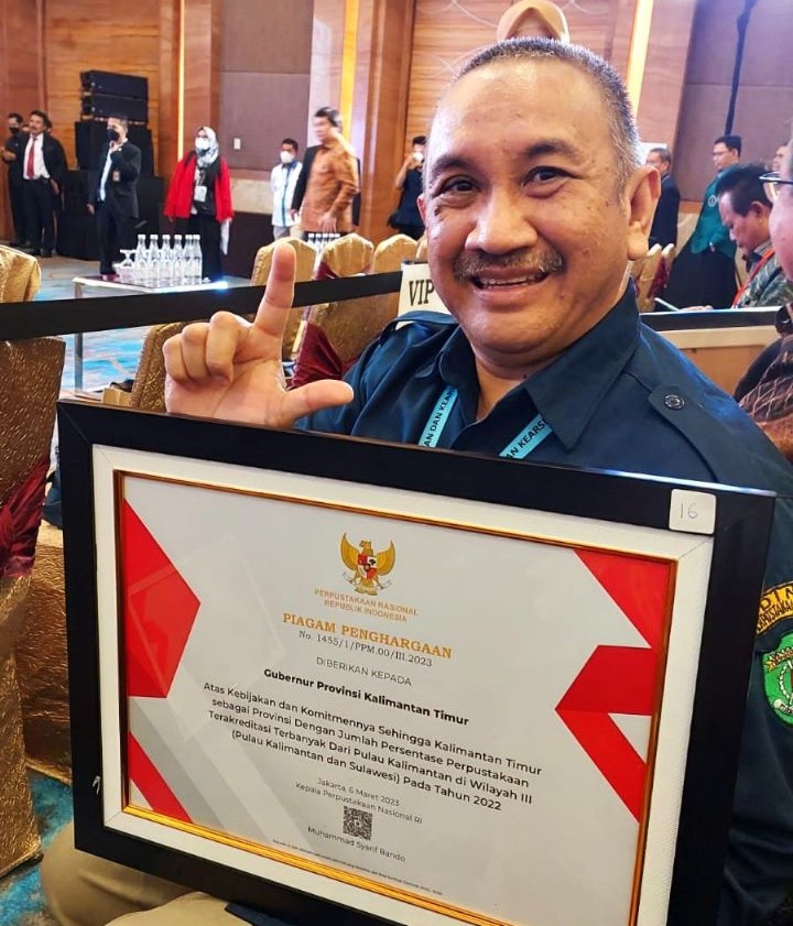 Kepala DPK Kaltim, Muhammad Syafranuddin bersama penghargaan dari Perpusnas RI