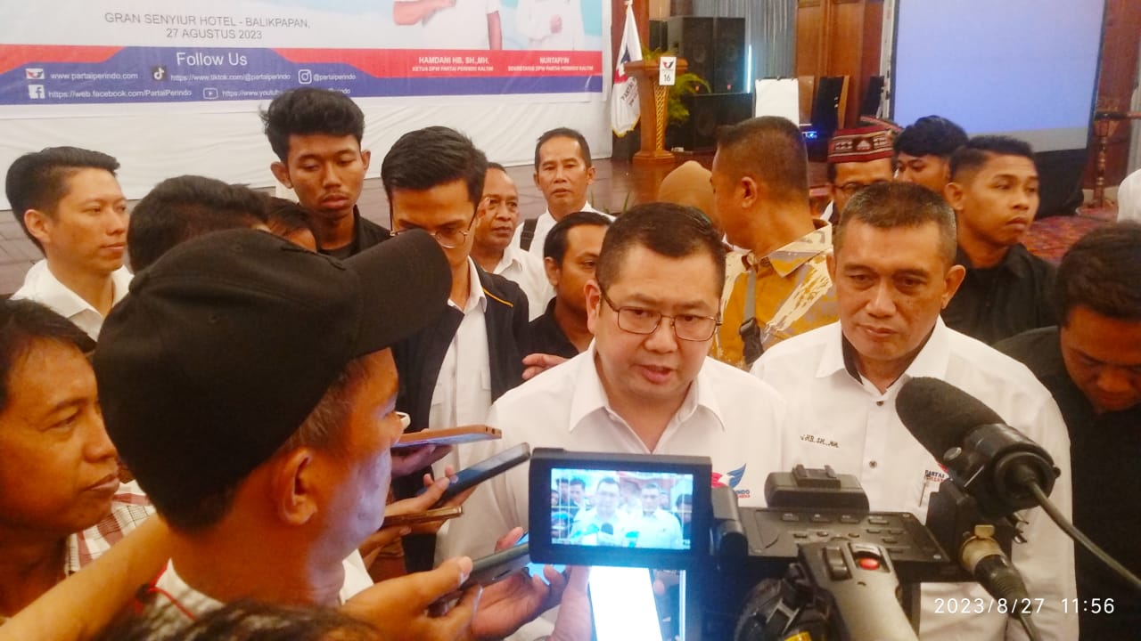 Ketua Umum DPP Perindo Hary Tanoesoedibjo memberikan keterangan kepada awak media usai memimpin rapat konsolidasi Perindo Kaltim di Hotel Grand Senyiur, Balikpapan, Minggu (27/8/2023).