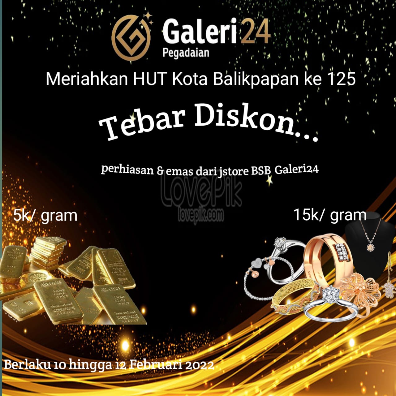 Manajer Jstore BSB Galeri 24 Fitriani mengatakan, pada momentum HUT ke-125 Kota Balikpapan pihaknya memberikan diskon secara besar-besaran bagi masyarakat yang ingin berbelanja emas batangan di Galeri 24.   “Diskon diberikan 5/gram untuk emas batangan dan 15/gram untuk perhiasan, diskon ini berlaku mulai tanggal 10 hingga 12 Februari 2022,” ujar Fitriani kepada media ini pada Kamis (10/2/2022).