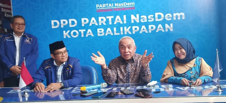 Ketua DPW Partai NasDem Kaltim yang juga Gubernur Kaltim Isran Noor (tengah) bersama Ketua DPD NasDem Balikpapan Ahmad Basir saat memberikan penjelasan kepada awak media