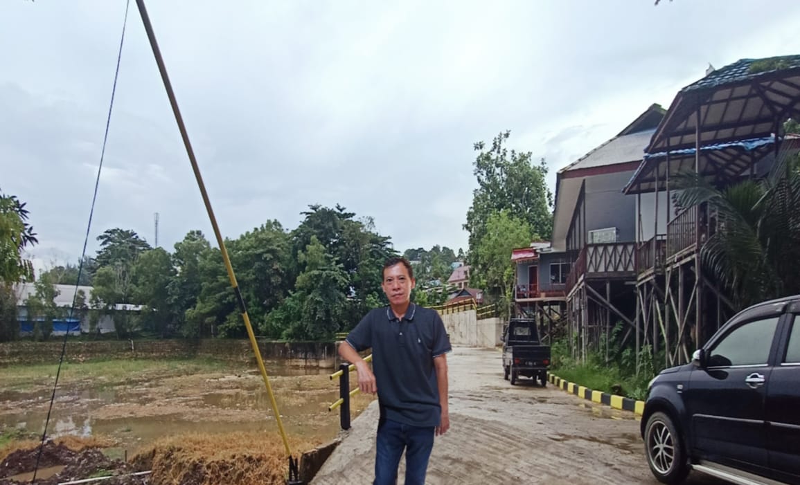 Ketua LPM Telaga Sari Gandung saat memantau proyek perbaikan Waduk Telaga Sari yang mengalami kebocoran