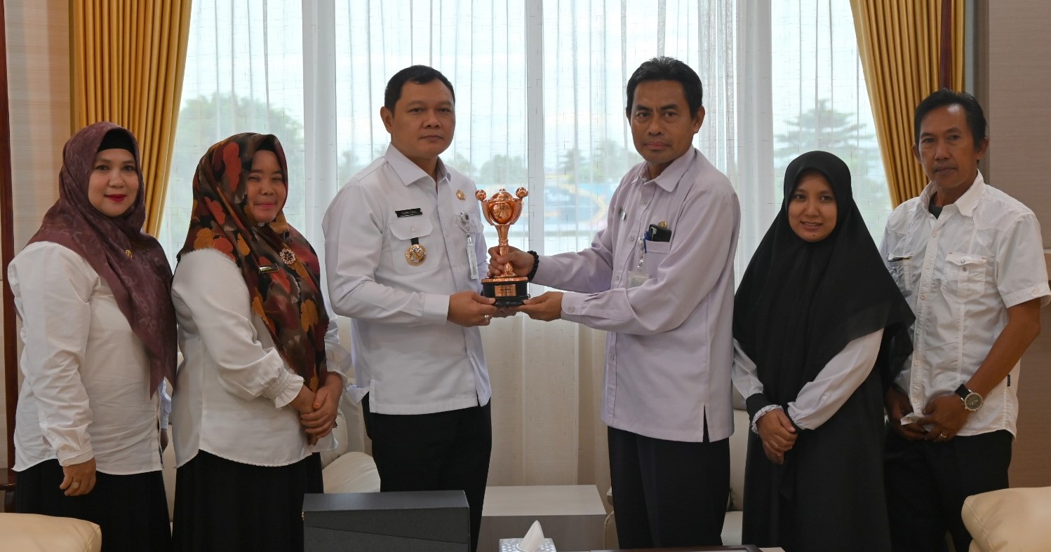 Kepala DP2KBP3A Paser Amir Faisol menyerahkan penghargaan Anugerah Parahita Ekapraya ke Bupati Paser dr. Fahmi Fadli, di ruang kerjanya, pada Rabu (19/6/2024).