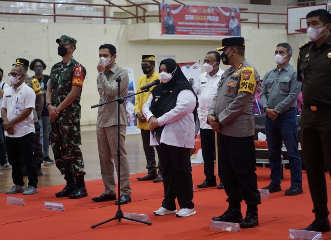 TANA PASER,suarabalikpapan.com-Sinergitas TNI, Polri dan Pemerintah Kabupaten Paser melaksanakan gebyar vaksinasi Covid-19 di seluruh kecamatan di Kabupaten Paser di GOR Sadurengas, Kecamatan Tanah Grogot, Rabu (23/2/2022). Kegiatan yang menyediakan doorprize 3 unit sepeda motor, puluhan unit sepeda, barang elektronik, emas antam serta hadiah menarik lainnya dihadiri Ketua DPRD Paser Hendra Wahyudi, Dandim 0904/PSR Letkol Inf Ronald Wahyudi dan jajaran pejabat Pemkab Paser.