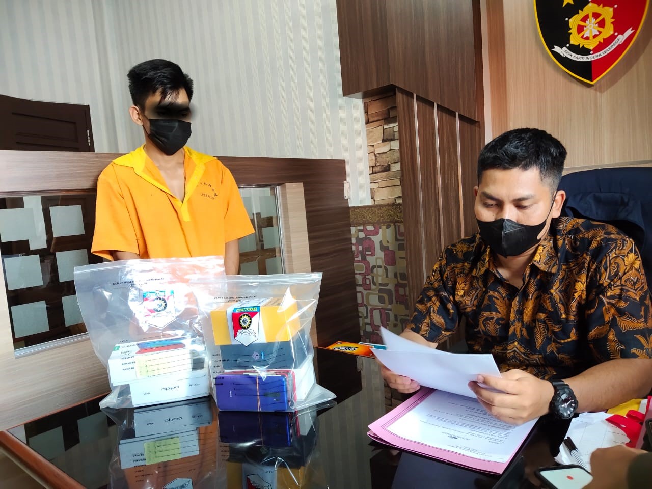 Kasat Reskrim Polres Paser AKP Dedik Santoso sedang memeriksa tersangka jambret dan barang bukti