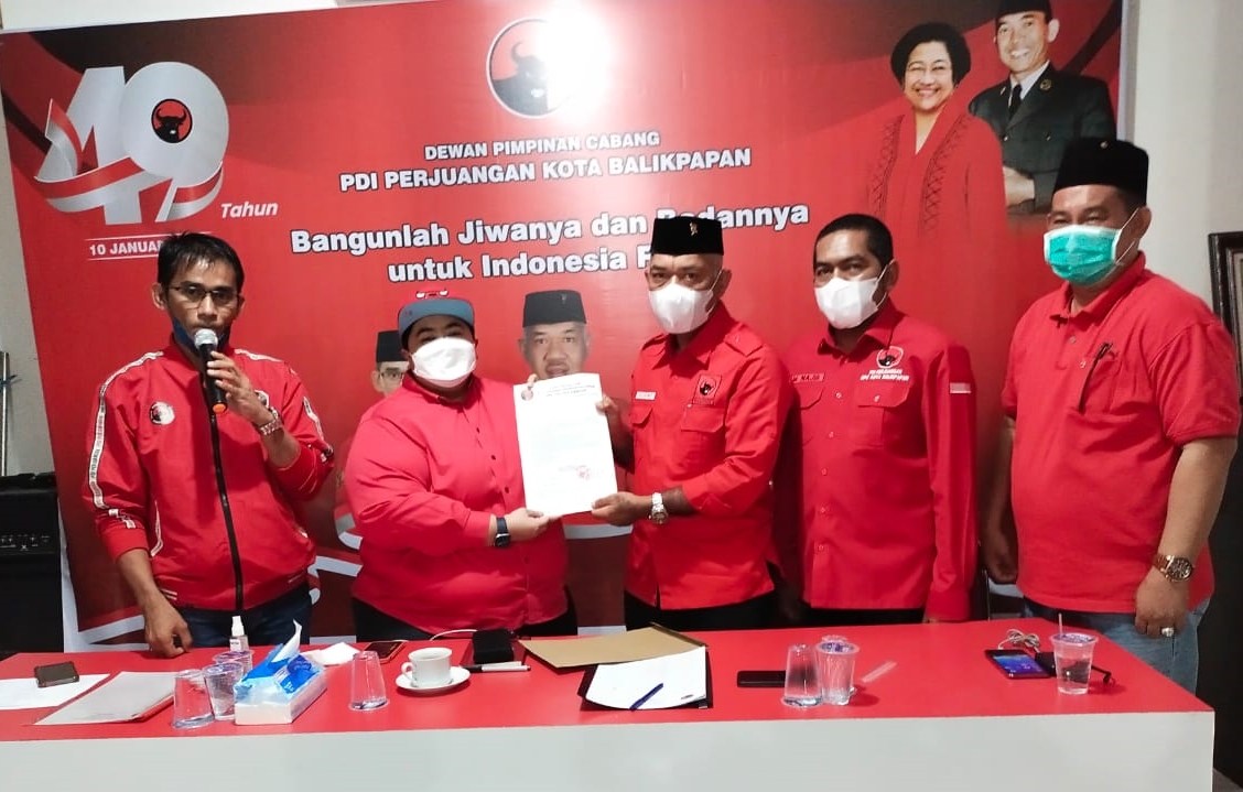 Budiono menerima SK Calon Wawali Balikpapan dari Sekretaris DPD PDI Perjuangan Kaltim Ananda Emira Moeis di Kantor Sekretariat DPC PDI Perjuangan Kota Balikpapan Kompleks Perumahan Sepinggan Pratama
