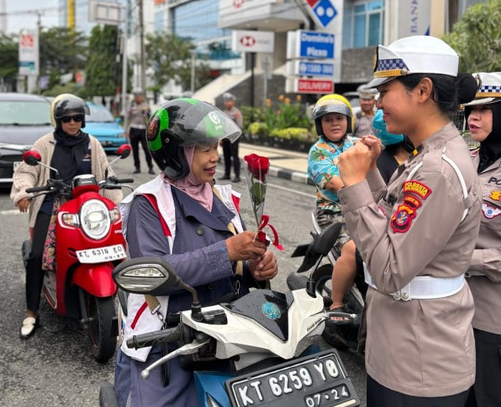Dalam rangka Hari Kartini 2025, Polwan Polresta Balikpapan membagikan bunga kepada pengendara di lampu merah sambil mengimbau keselamatan berkendara.