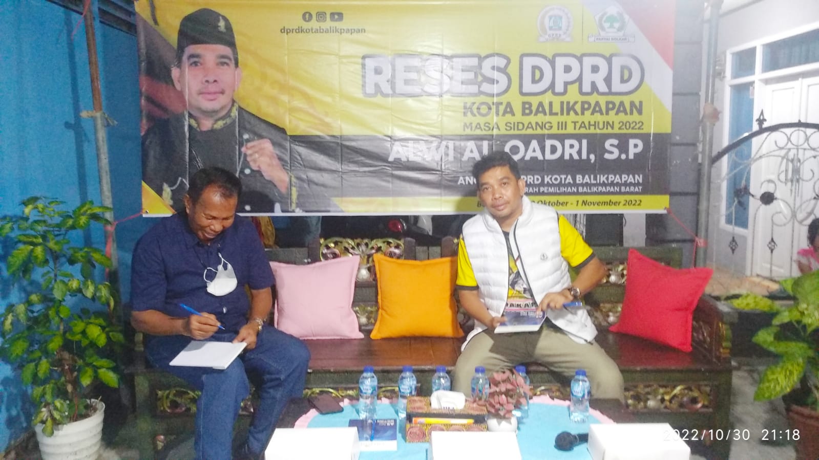 BALIKPAPAN,suarabalikpapan.com-Ketua Komisi III DPRD Kota Balikpapan Daerah Pemilihan (Dapil) Balikpapan Barat dari Fraksi Golkar Alwi Al Qadri menggelar Reses Masa Persidangan III/2022, di Jalan Sepaku Laut RT 06, Kelurahan Margasari, Balikpapan Barat, pada Minggu (30/10/2022) malam.