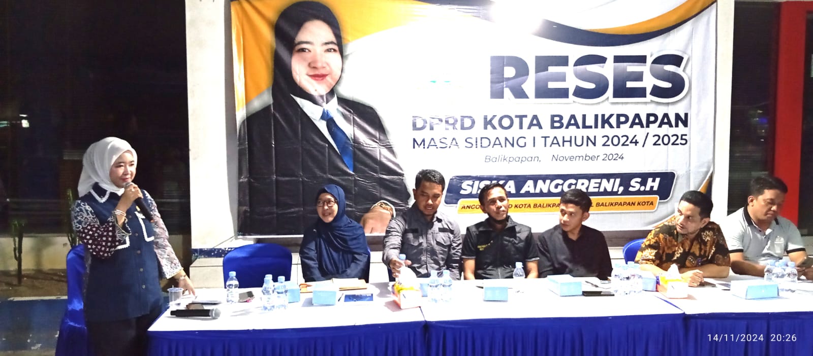 BALIKPAPAN, suarabalikpapan.com – Anggota DPRD Kota Balikpapan, Siska Anggreni, menggelar reses pada Kamis malam (14/11/2024) di RT 27, Kelurahan Klandasan Ilir, Kecamatan Balikpapan Kota. Kegiatan reses ini merupakan bagian dari masa sidang pertama tahun 2024-2029, setelah Siska terpilih sebagai anggota DPRD dari Fraksi NasDem. Selain Siska, hadir juga perwakilan dari Dinas Pekerjaan Umum, Dinas Pendidikan, Camat Balikpapan Kota, Lurah Klandasan Ilir, Kepala Puskesmas Klandasan Ilir, serta Ketua RT se-Kota Balikpapan.