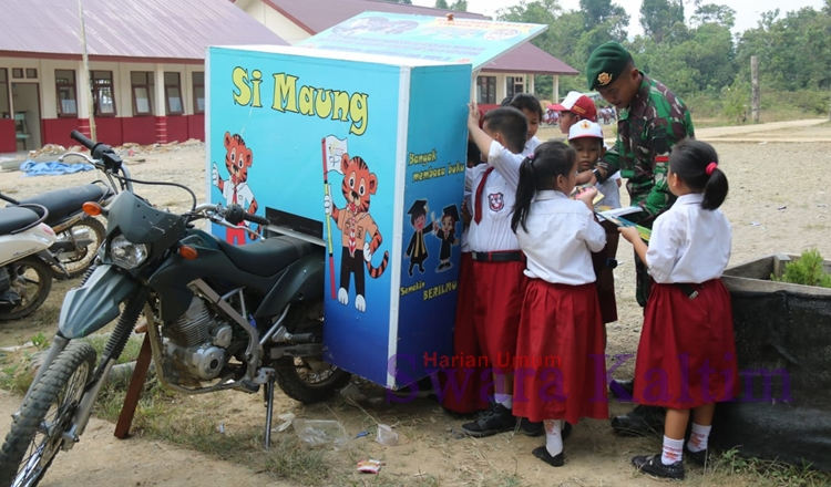 MAHAKAM ULU,suarabalikpapan.com–Satuan Tugas Perbatasan (Satgas-Pamtas) Batalyon Yonif Raider 303/SSM Kostrad, menerjunkan si Maung yang dijadikan sebagai penggerak perpustakaan keliling langsung mendatangi anak anak dan murid SD di perbatasan Kabupaten Mahakam Ulu dengan negara tetangga Serawak Malaysia. Si Maung atau perpustakaan keliling ini dibuat semacam kotak lemari yang berisi buku diatas boncengan sepeda motor operasional dari pasukan Setia Sampai Mati ini berkeliling ke lokasi sekolah SD di Mahulu Provinsi Kaltim bahkan hingga ke Kalimantan Utara.