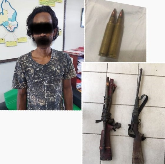 “Dari hasil penggeledehan Kami mendapati 1 pucuk senjata api rakitan terbuat dari besi dengan gagang kayu dengan panjang sekitar 90 cm yang disimpan tersangka di kamar mandi. Kami juga menemukan 1 pucuk senjata api rakitan terbuat dari besi dengan gagang kayu sepanjang 70 cm  disimpan di bawah kolong rumah beserta 2 butir peluru kaliber 5,56 mm  disimpan di dalam tas plastik yang digantung di dalam rumah,” ujarnya.