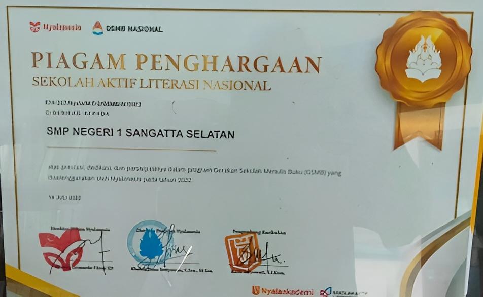 SANGATTA,suarabalikpapan.com –  SMP Negeri 1 Sangatta Selatan mendapat penghargaan tingkat nasional sebagai Sekolah Aktif Literasi Nasional pada tahun 2022.   “Sebagai juara Penulisan Puisi tingkat sekolah jenjang SMP sederajat. Semoga ini menjadi motivasi bagi semua keluarga besar SMP Negeri 1 Sangatta Selatan  dan sekolah-sekolah lainnya,” kata Kepala sekolah SMP Negeri 1 Sangatta Selatan Juliansyah di ruang kerjanya, Selasa (2/5/2023).