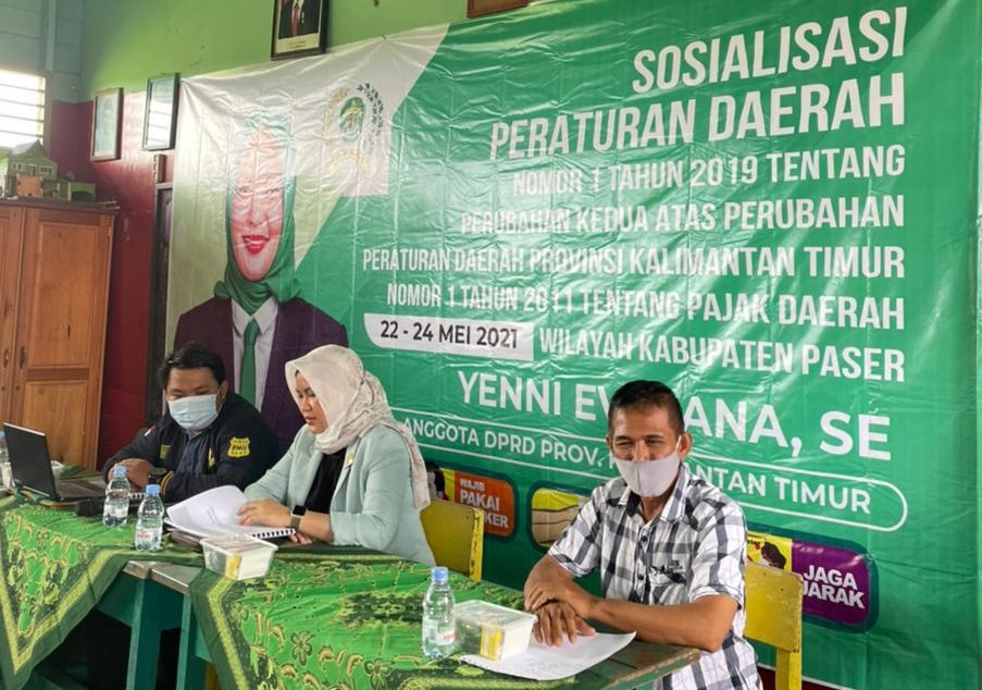 TANA PASER,suarabalikpapan.com-Anggota Komisi IV DPRD Provinsi Kaltim dari Fraksi PKB, Yenni Eviliana menggelar Sosialisasi Peraturan Daerah (Sosper) Nomor 1 Tahun 2019 tentang Pajak Daerah, di Desa Muara Pasir, Kecamatan Tanah Grogot, Minggu (23/5/2021). Wakil Ketua DPW PKB Kaltim ini didampingi narasumber Achmad Syaukani, SE dan Sri Ardianto.