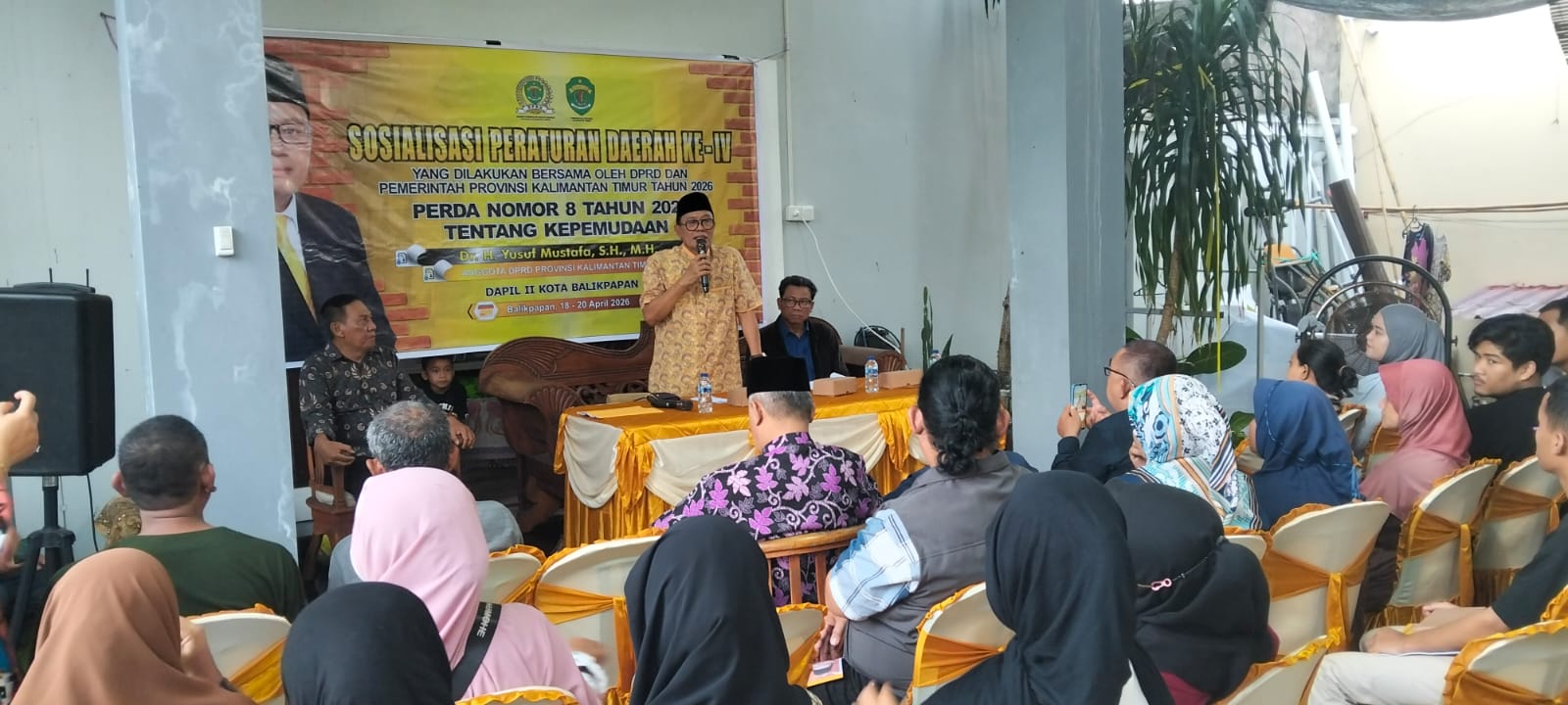 BALIKPAPAN,suarabalikpapan.com – Anggota DPRD Provinsi Kalimantan Timur, Yusuf Mustafa, menggelar sosialisasi Peraturan Daerah (Perda) Nomor 8 Tahun 2022 tentang Kepemudaan di Jalan Inpres V RT 19, Kelurahan Muara Rapak, Kecamatan Balikpapan Utara, Minggu (19/4/2026).