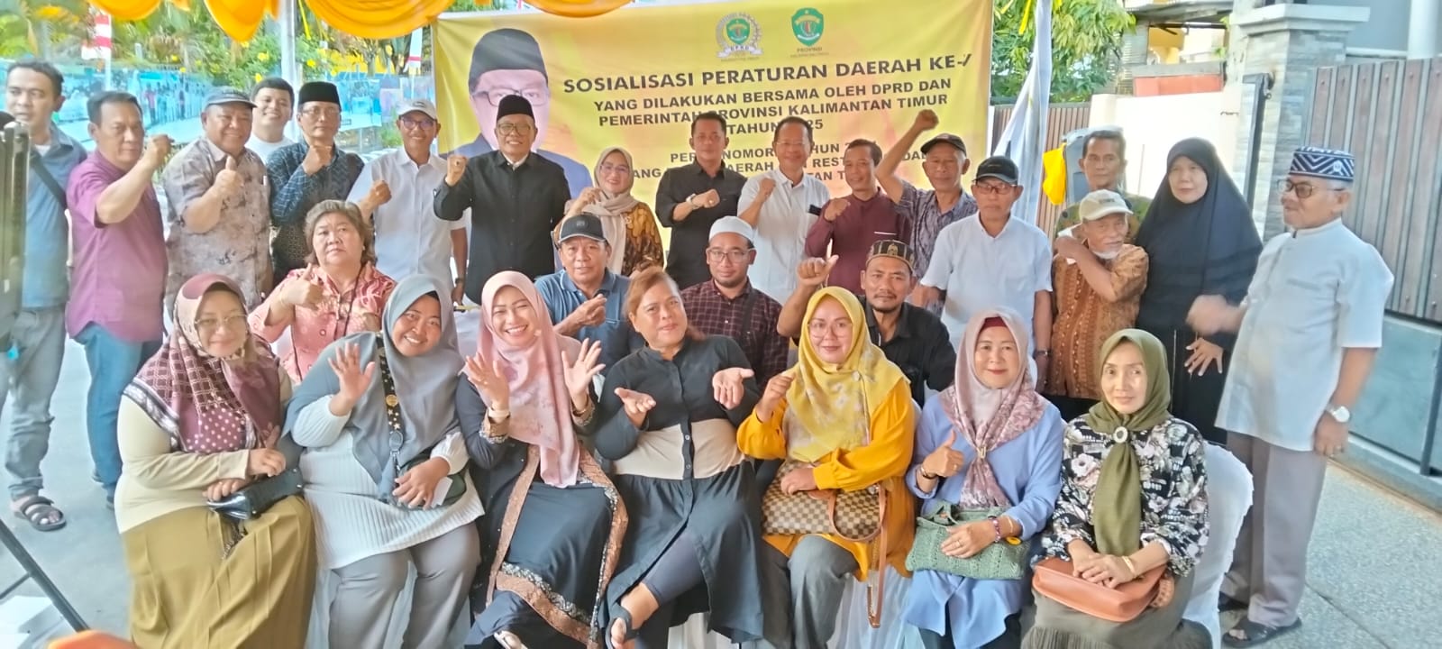 Anggota DPRD Kaltim Yusuf Mustafa berfoto bersama usai Sosialisasi Perda Pajak Daerah dan Retribusi Daerah, di Kelurahan Gunung Bahagia, Kecamatan Balikpapan Selatan, pada Sabtu (3/5/2025).