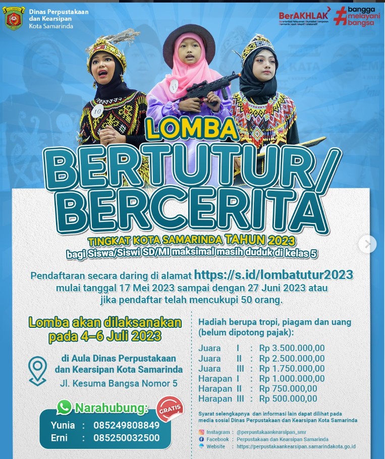 “Lomba Bertutur akan kita laksanakan di aula Dinas Perpustakaan Samarinda selama 3 hari, 4-6 Juli bulan depan. Untuk pendaftaran sudah kita buka sejak 17 Mei hingga 27 Juni atau jika pendaftar telah mencukupi 50 orang,” ucap kepala Dispusip Samarinda Erham Yusuf kepada media ini, Rabu (14/6/2023). Menurut Erham, lomba bertutur ini bertujuan untuk menumbuhkembangkan budaya gemar membaca anak-anak melalui berbagai bacaan dan media untuk menanamkan cinta kebudayaan bangsa, membangun karakter, kecerdasan, inovasi serta kompetitif. Tentunya mantan Kabag Humas dan Protokol Pemkot Samarinda ini berharap melalui kegiatan ini akan menumbuhkembangkan daya saing positif antar siswa di kota Samarinda.