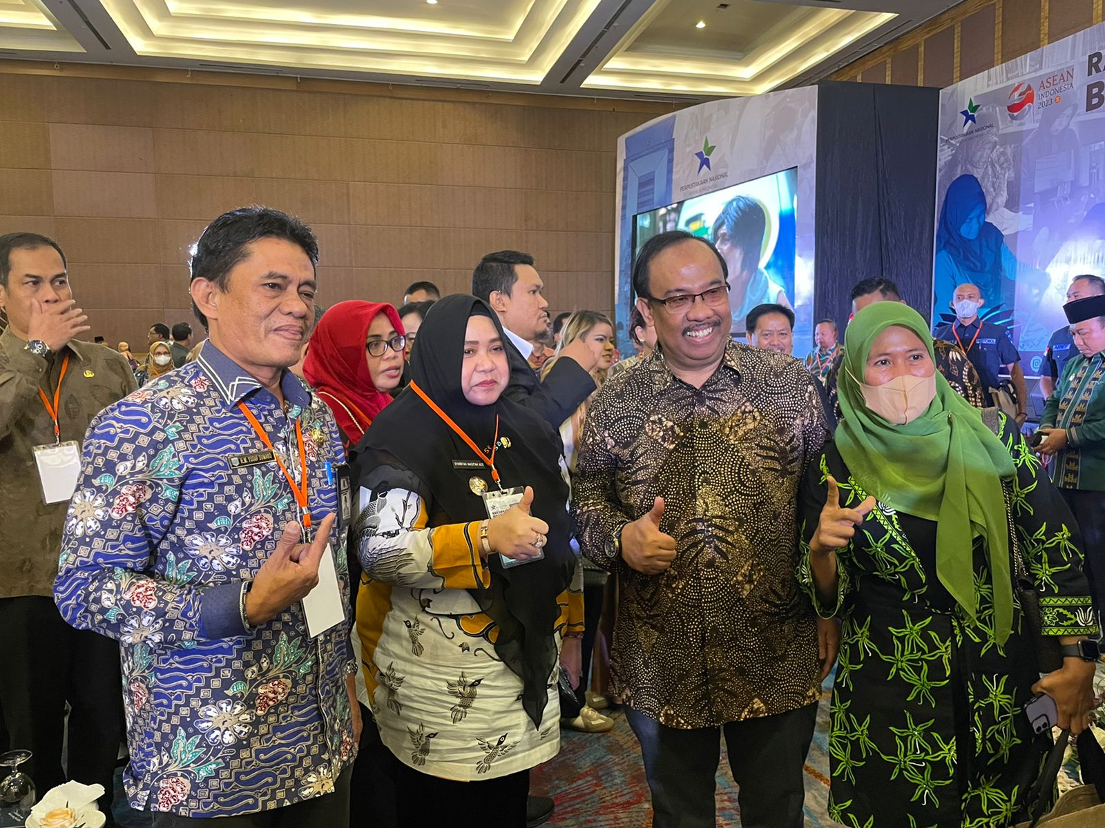 Wabup Masitah Assegaf berfoto bersama di sela-sela Rakornas Bidang Perpustakaan di Ball Room Pullman Hotel Jakarta, pada Senin (6/3/2023).