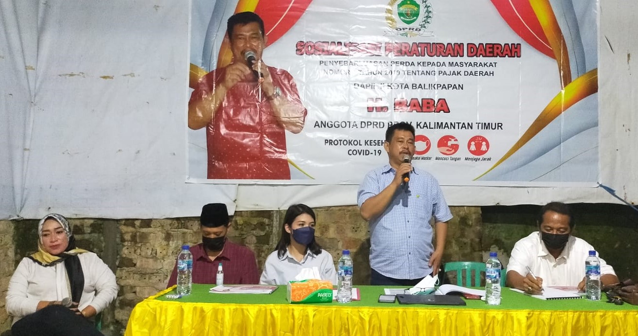 BALIKPAPAN,suarabalikpapan.com-Sekretaris Komisi III DPRD Kaltim, H Baba, dari Fraksi PDI Perjuangan, melakukan sosialisasi Perda Nomor 01 Tahun 2019 tentang Perubahan Kedua Atas Perubahan Perda Provinsi Kaltim Nomor 1 Tahun 2011 Tentang Pajak Daerah, di Kelurahan Telaga Sari, Balikpapan Kota dekat Kantor Chevron Indonesia Company (CICo), pada Minggu (14/11/2021).