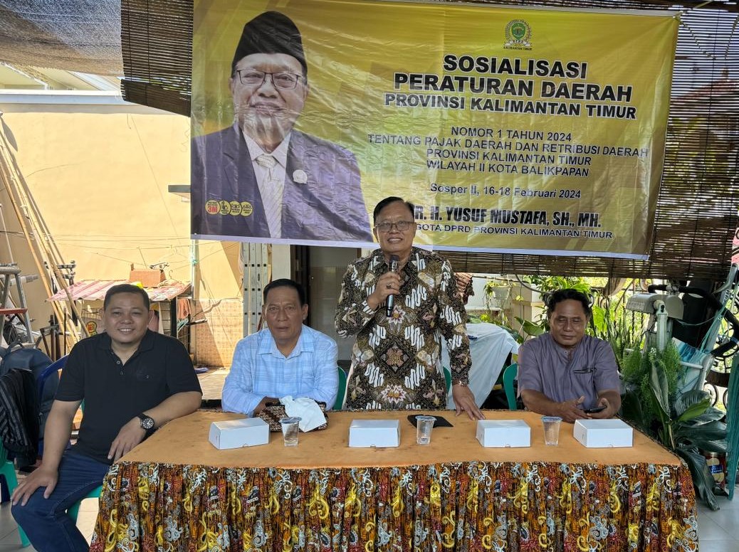 BALIKPAPAN,suarabalikpapan.com-Wakil Ketua Komisi I DPRD Kaltim, DR H Yusuf Mustafa SH MH, dari Fraksi Partai Golkar, melakukan Sosialisasi Peraturan Daerah (Sosper) Kaltim Nomor 1 Tahun 2024 Tentang Pajak Daerah dan Retribusi Daerah di Kelurahan Gunung Samarinda Baru, Kecamatan Balikpapan Utara, pada Minggu (18/2/2024) sore.
